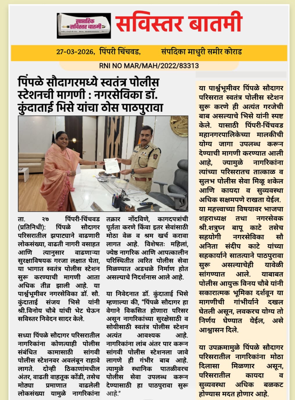 पिंपळे सौदागरमध्ये स्वतंत्र पोलीस ठाण्याबाबत ठोस पाठपुरावा.